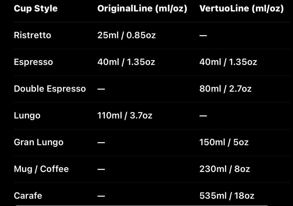 When it comes to Nespresso, one of the biggest differences between the two systems—OriginalLine and VertuoLine—is the range of cup sizes and brewing styles they support.