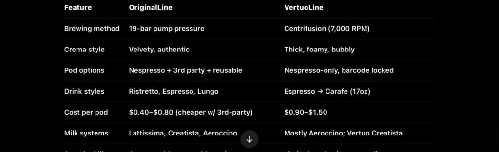 OriginalLine uses 19-bar pressure for authentic espresso shots and accepts third-party pods, making it cheaper per cup but limited to small drinks. VertuoLine uses Centrifusion spinning technology to brew everything from espresso to 17oz carafe servings, but only works with Nespresso-branded pods at higher cost. Choose OriginalLine if you want authentic espresso flavor and pod variety, or VertuoLine if you prefer larger coffee drinks and convenience.
