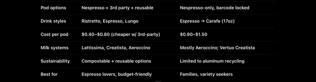 Vertuo’s larger pods cost more, making long-term costs higher if you drink big mugs daily.